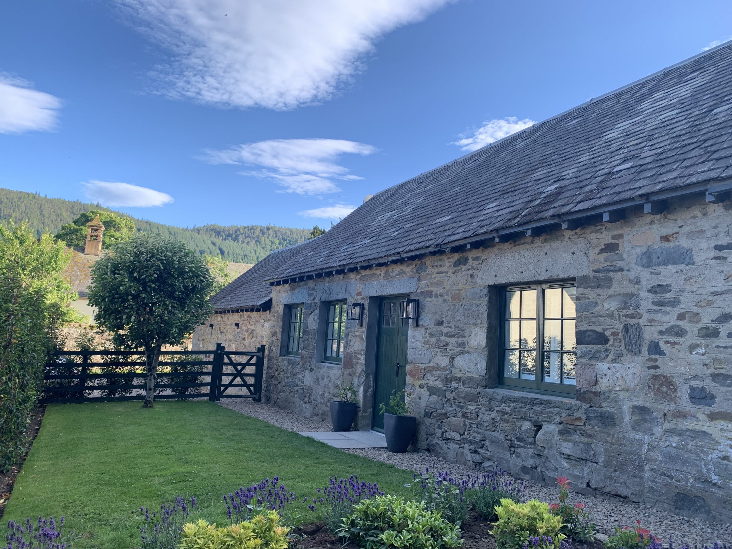The cottage sits in its own grounds and has private off-road parking with easy access to the garden and front doors. It is actually part of old steading buildings and is very characterful with pretty cottage style windows, high ceilings and deep windowsills.