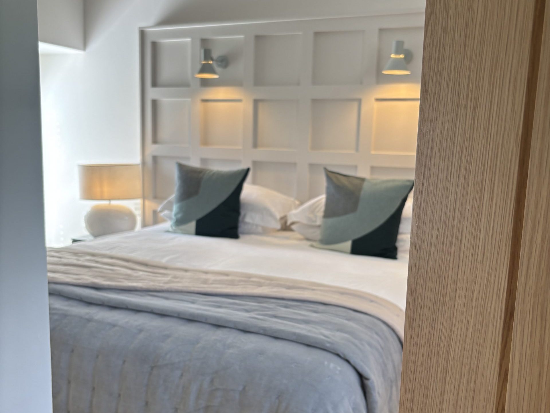 Next door is a luxuriously appointed bedroom with 6-foot bed which can be made as either a king-size double or twin arrangement. There are two mini-wardrobes and further storage units as well as ironing facilities. There is also a 40-inch TV in the bedroom. Windows face both east and west.