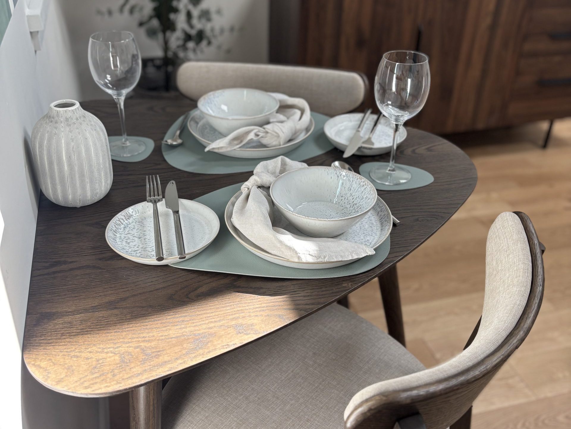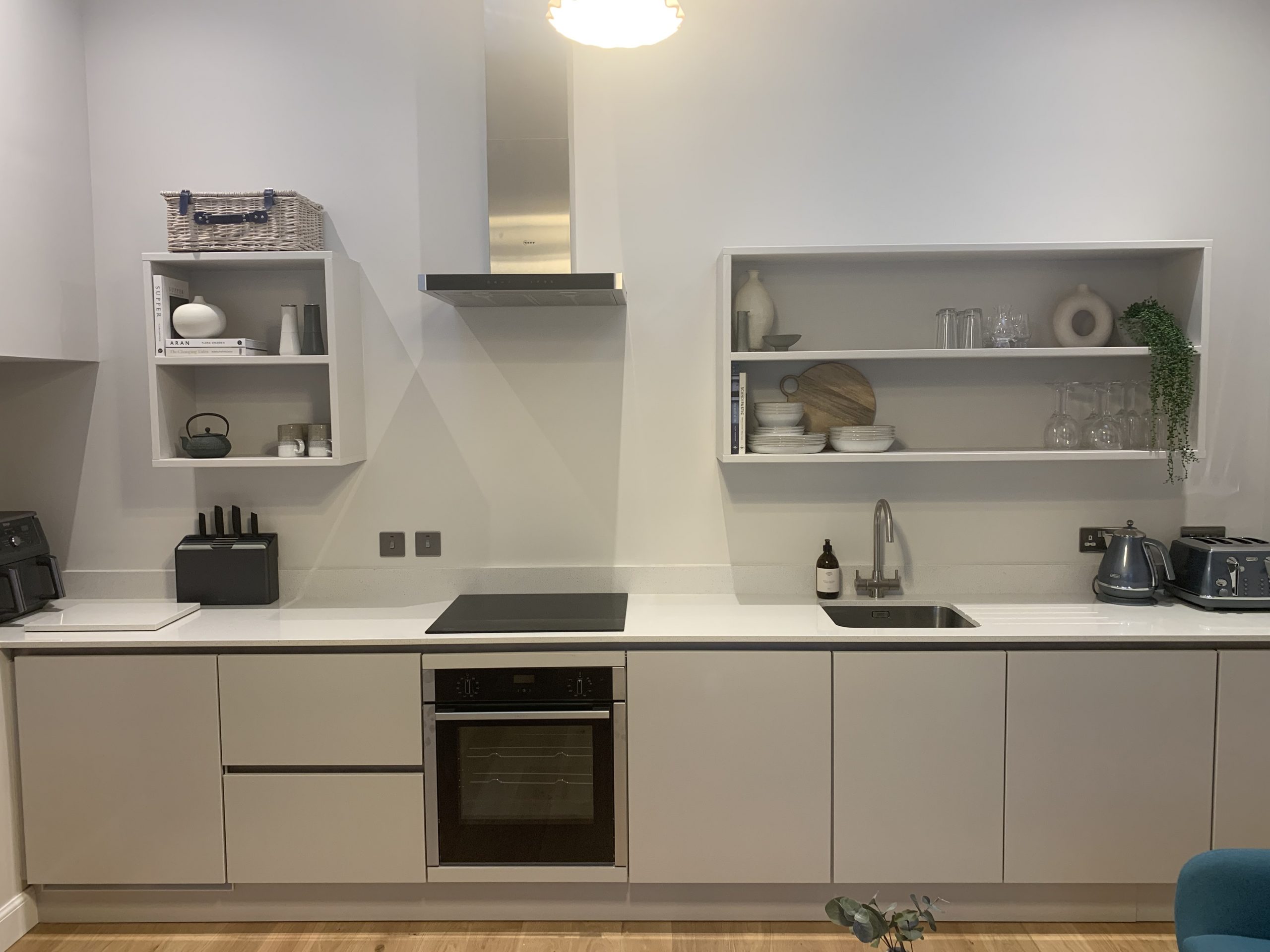 As you go in, to the left is a fully kitted out open-plan kitchen lounge dining area. The kitchen units house an oven and a 4-ring induction hob, a chrome sink, a washing machine and dishwasher, a fridge freezer, bin storage area and pan drawers with further storage units above. There is further larder space contained in the lounge area. There is also an air fryer, toaster, kettle and coffee machine.
