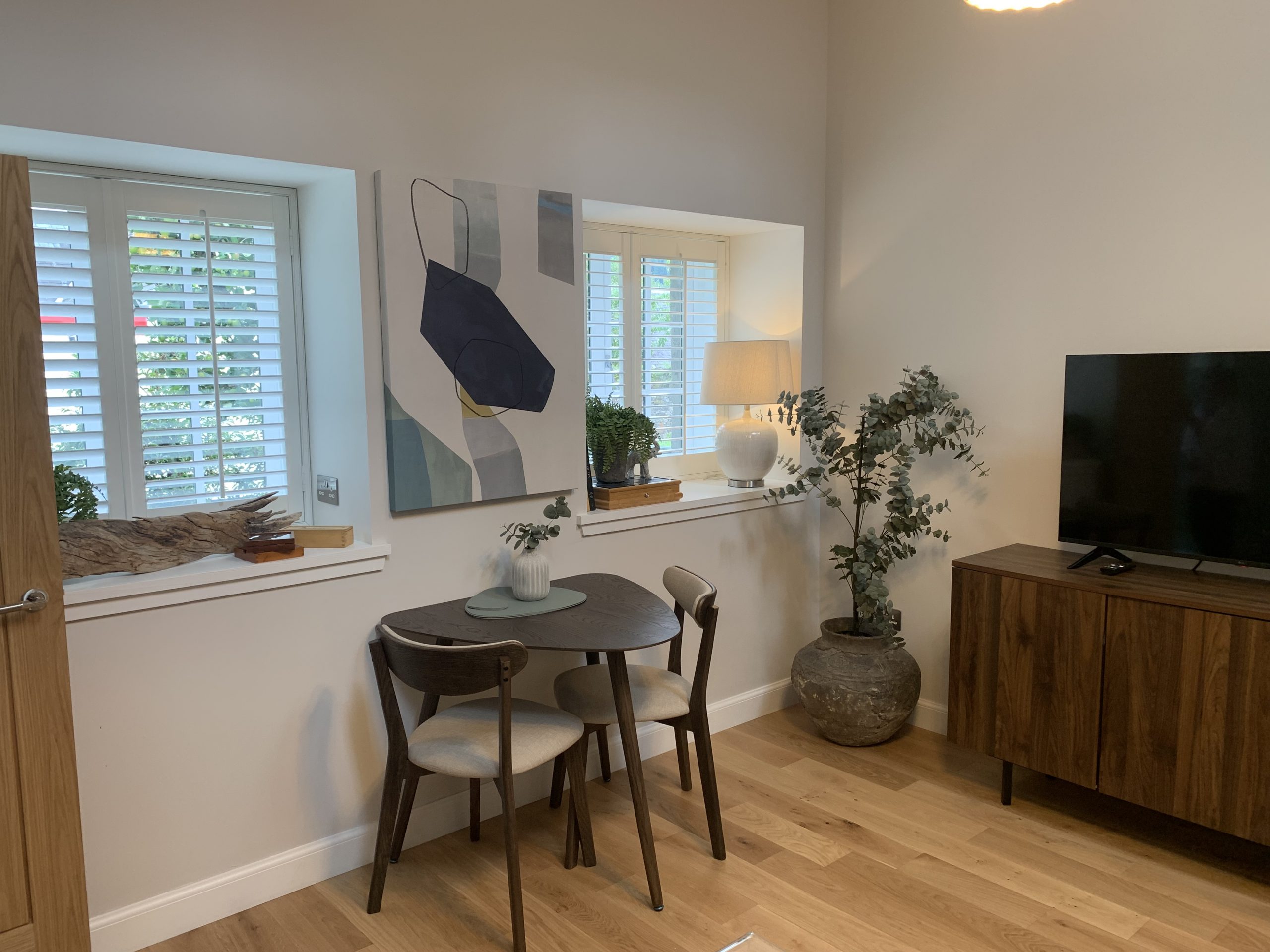 The lounge has two double windows with shutters and views into the pretty garden. There is a comfy seating area facing a 55-inch TV and a dining table to the side.